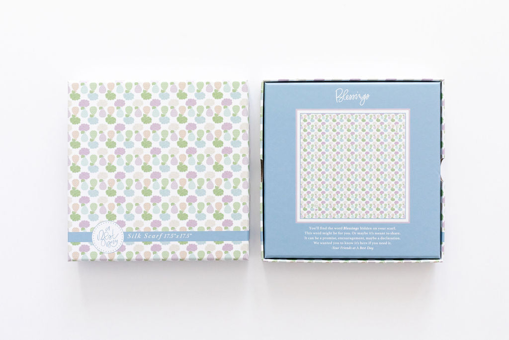 Our scarves are hand illustrated and made from 100% silk. Each scarf comes packaged in a beautiful box with packaging unique to each design. Each scarf also comes with a special word integrated into the design and on the box.