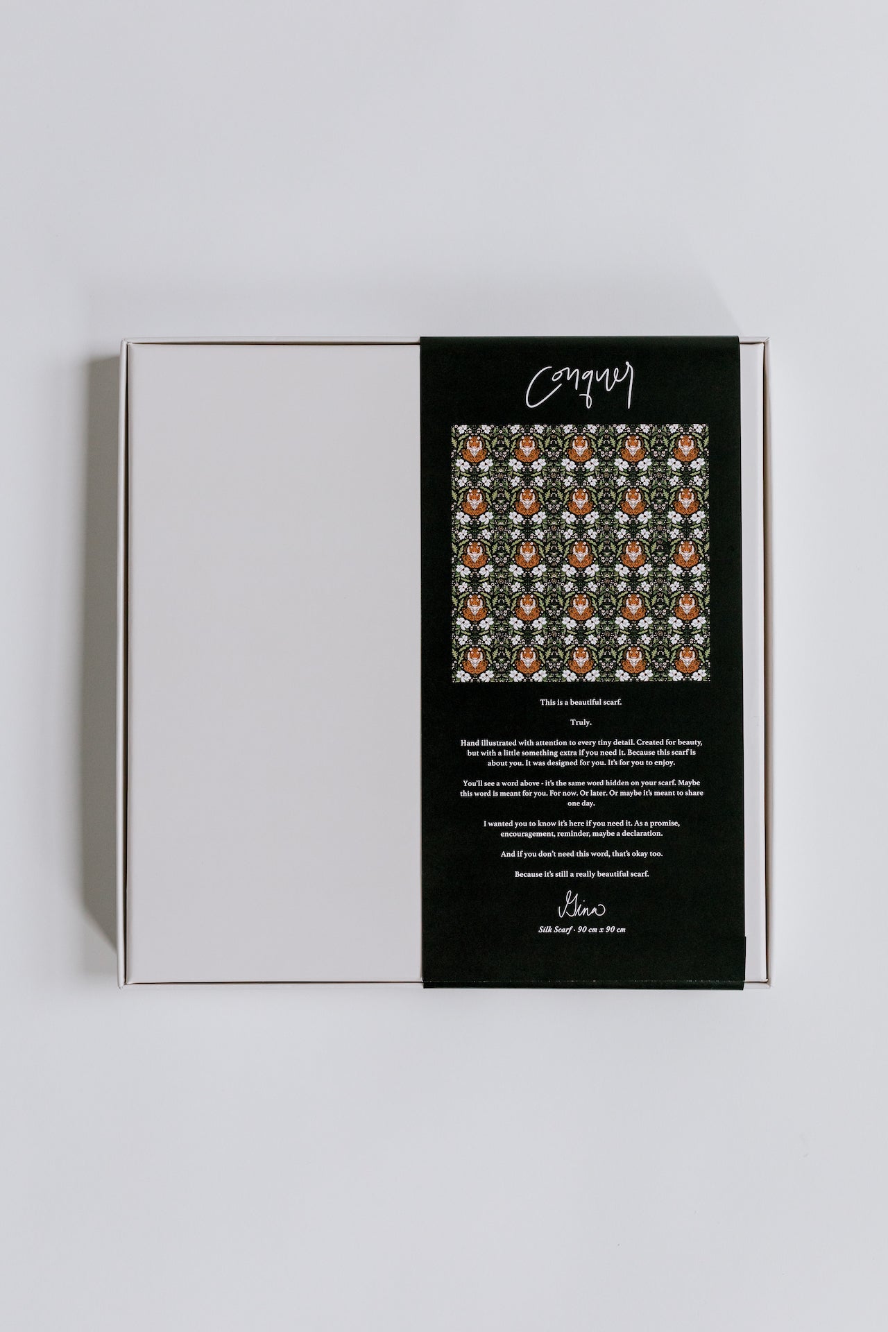 Our scarves are hand illustrated and made from 100% silk. Each scarf comes packaged in a beautiful box with packaging unique to each design. Each scarf also comes with a special word integrated into the design and on the box.