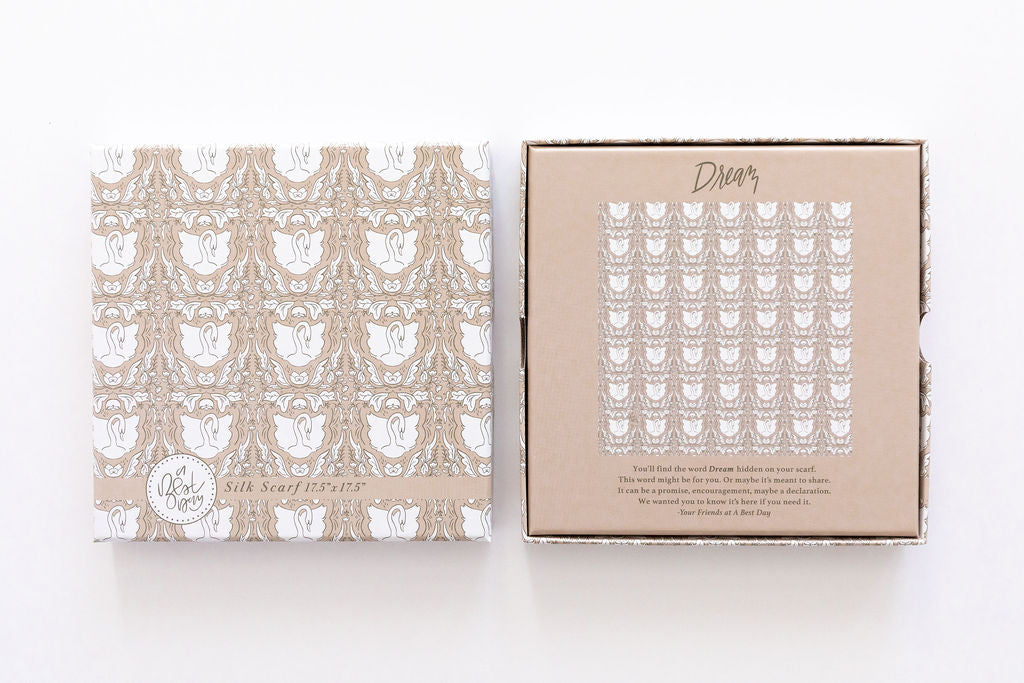 Our scarves are hand illustrated and made from 100% silk. Each scarf comes packaged in a beautiful box with packaging unique to each design. Each scarf also comes with a special word integrated into the design and on the box.