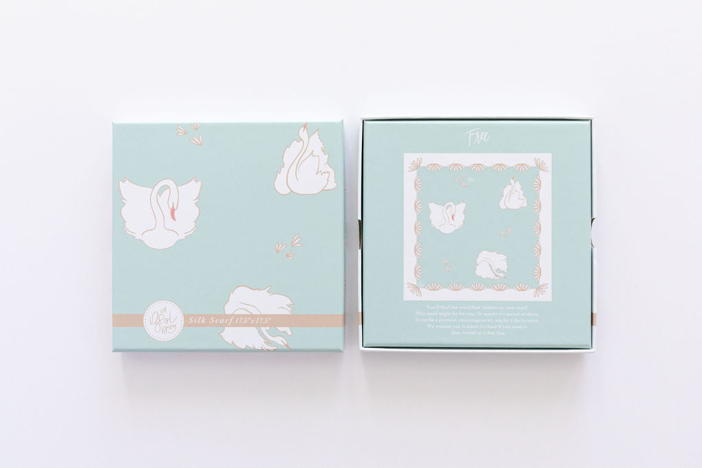 Our scarves are hand illustrated and made from 100% silk. Each scarf comes packaged in a beautiful box with packaging unique to each design. Each scarf also comes with a special word integrated into the design and on the box.