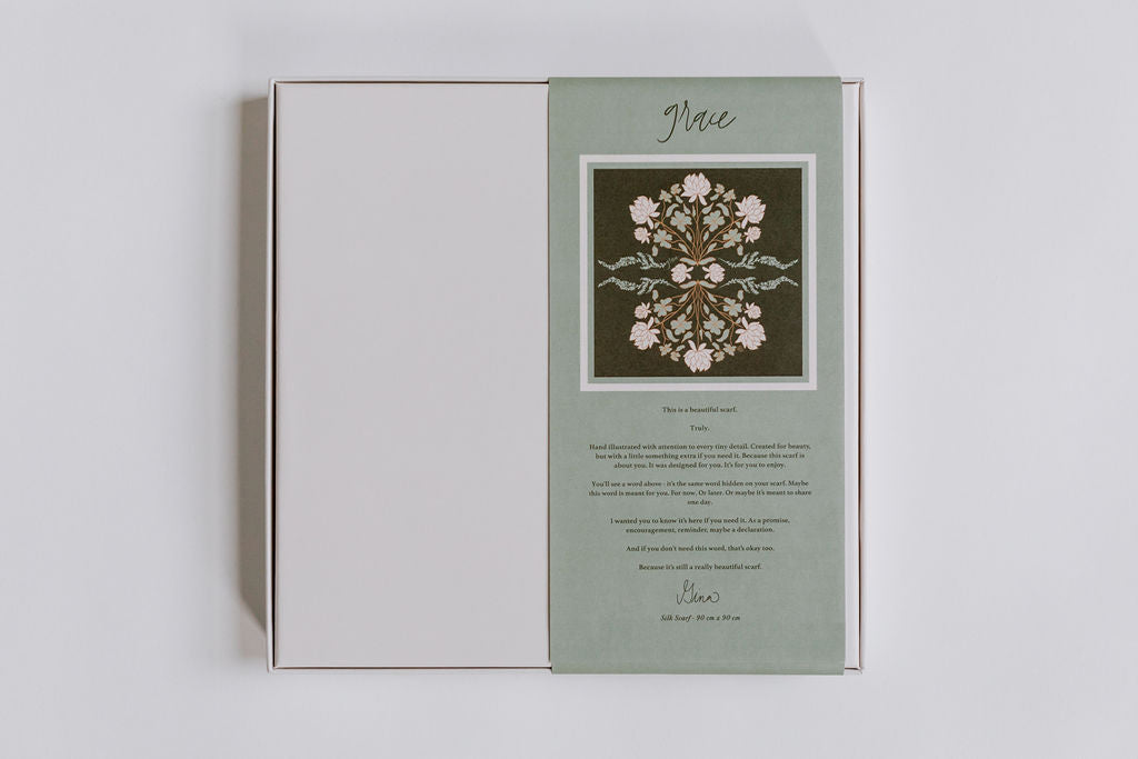 Our scarves are hand illustrated and made from 100% silk. Each scarf comes packaged in a beautiful box with packaging unique to each design. Each scarf also comes with a special word integrated into the design and on the box.