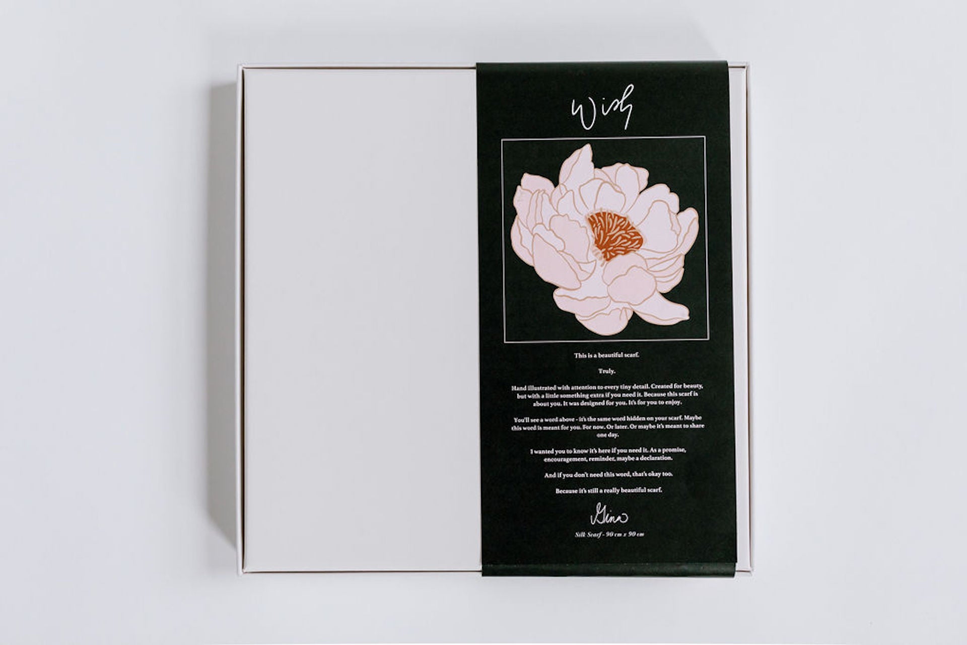 Our scarves are hand illustrated and made from 100% silk. Each scarf comes packaged in a beautiful box with packaging unique to each design. Each scarf also comes with a special word integrated into the design and on the box.